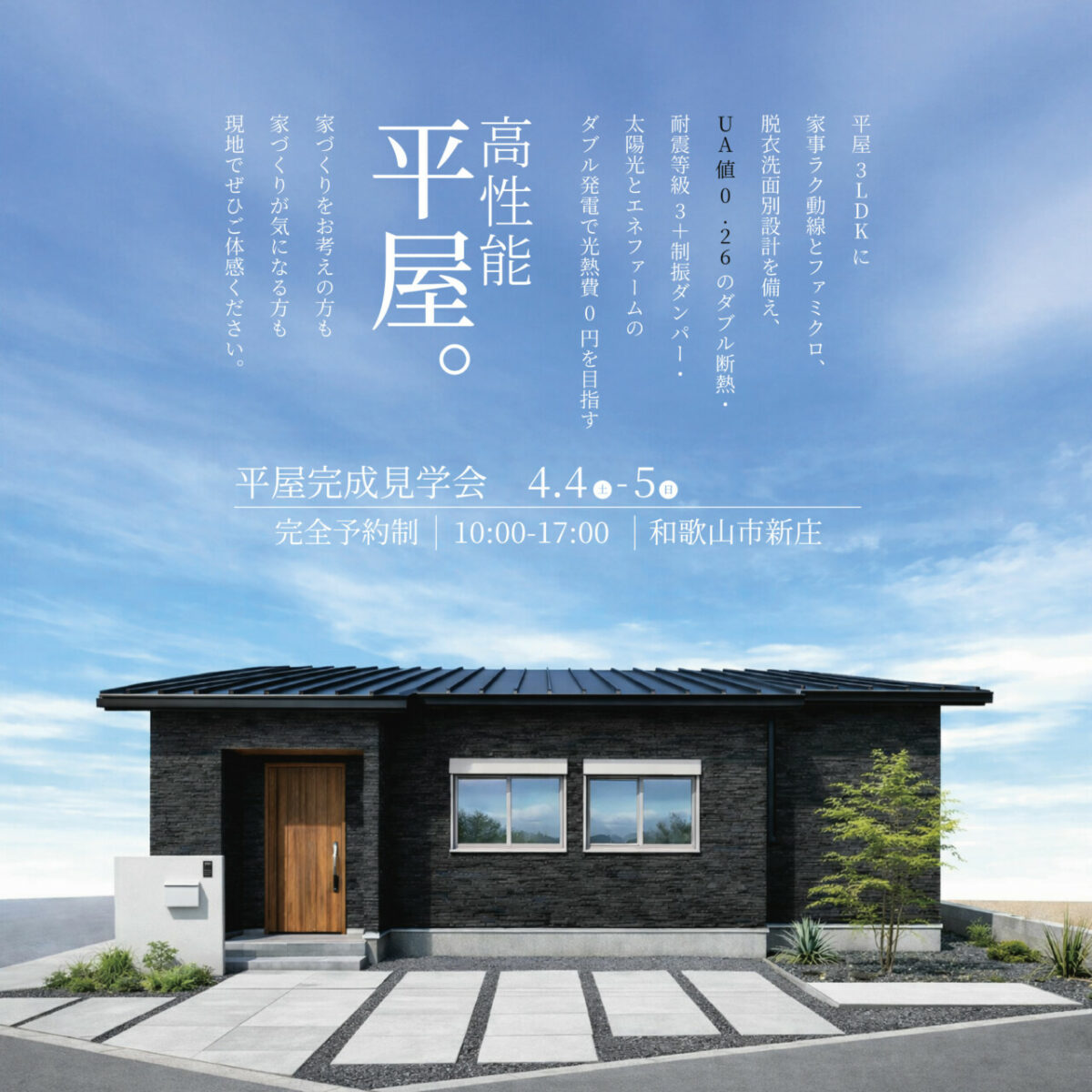 【”光熱費0円”を叶える平屋見学会】 4/4(土)・5(日) 完成見学会in和歌山市新庄