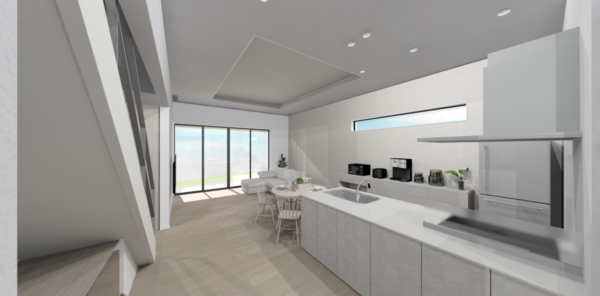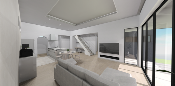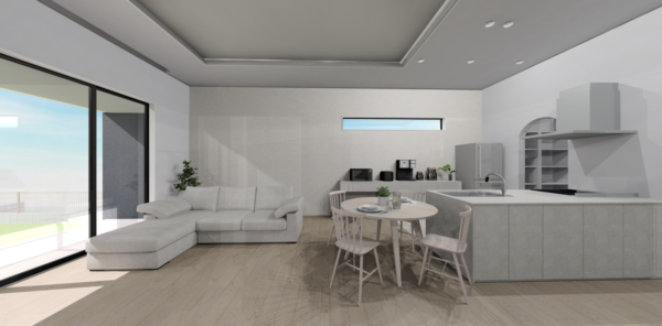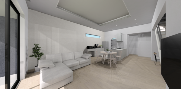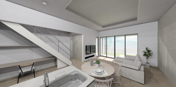 ◯ 折り上げ天井と間接照明の優しい光が包むLDK空間(21帖)