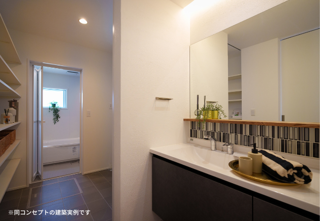 モールテックス仕上げのキッチン腰壁、タイルが映える洗面空間、心安らぐ寝室の間接照明など、家づくりの参考になるアイデアが随所に。素材感や空間の使い方をご覧ください。