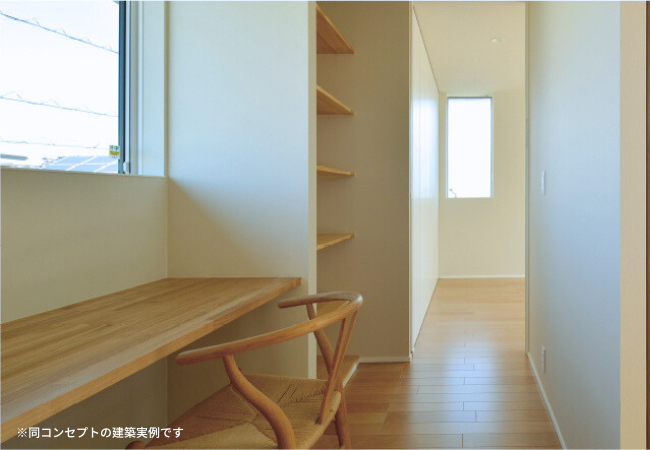 ドアで仕切らない、程よい「おこもり感」が魅力。中庭を眺めながら、落ち着いて作業に集中できます。コンセントやLAN、収納棚も計画し、コンパクトながら機能性も抜群です。