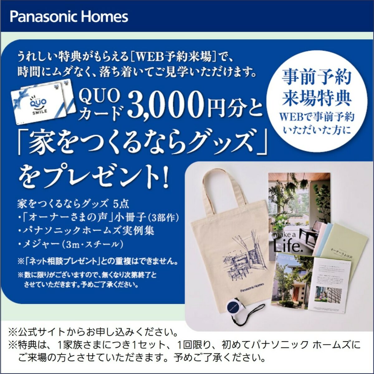 公式サイトより、WEB予約の上、ご来場いただいた方に、家をつくるならグッズ+QUOカード3,000円分プレゼント!